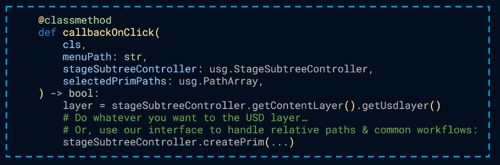 • The right click menu is fully customisable with custom Context Menu Plug-ins written in Python. More documentation on writing custom Context Menu Plug-ins can be found in the documentation under USD PROCESSING ENGINE > UsdSuperLayer > UsdSuperLayer > Plug-ins > Context Menu Plug-ins.