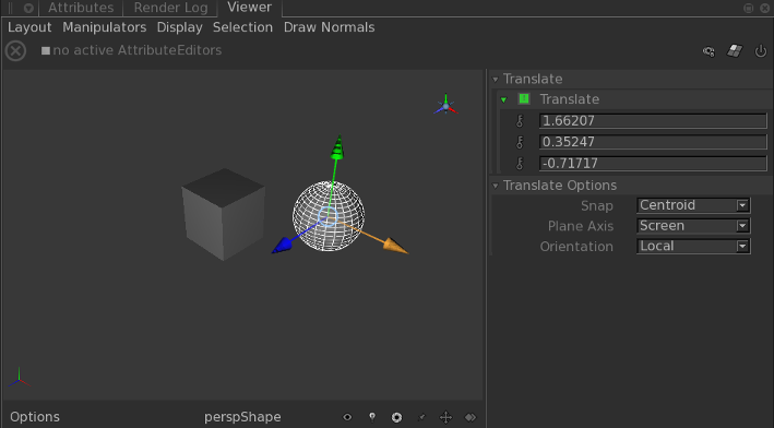 Using translation Manipulators you can move, rotate, and scale objects within the Viewer. With the Quick Editor you can change the translation Manipulator’s coordinate systems, plane axis, and whether the Manipulator snaps. You can also manually type values for any parameters represented by the Manipulator. To display the Quick Editor, make sure you have nothing selected, select the menu option Layout > Show Quick Editor (or press the A key). Then select an object, and a Manipulator to modify that Manipulator’s settings.