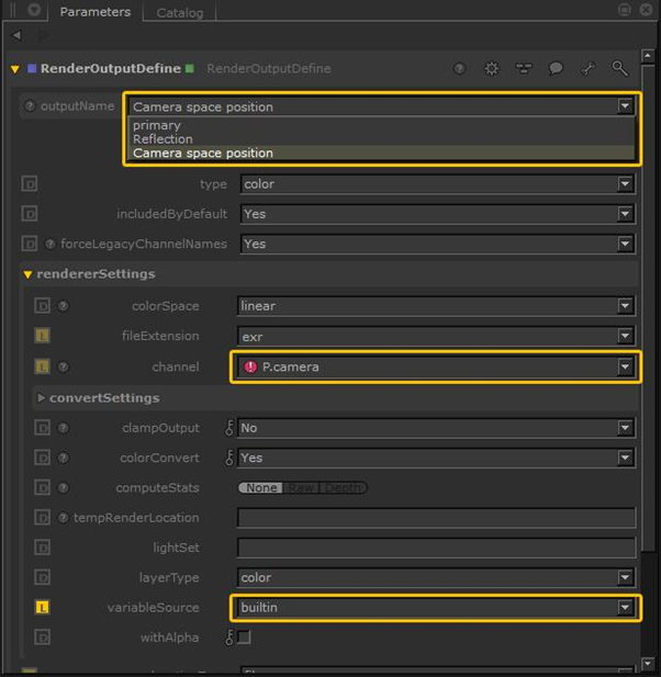 - Set the outputName parameter to Camera space position. The channel value changes automatically to match the selection.