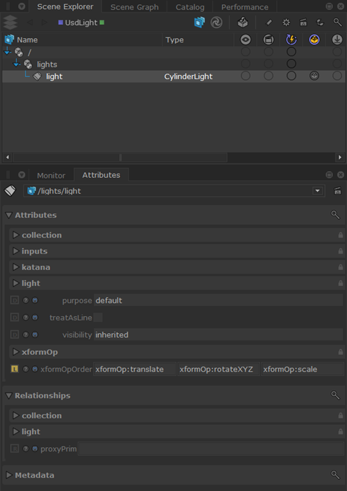 The Scene Explorer tab integrates seamlessly with the Attributes tab for inspecting USD properties. As with the Katana Scene Graph, click on any location in the USD Scene Graph to view the properties in the Attributes tab.