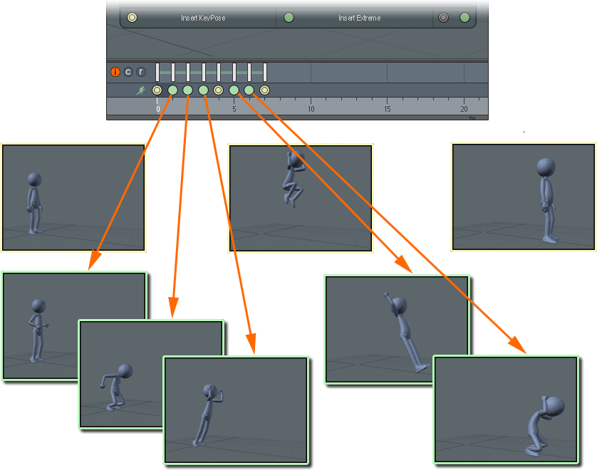 KeyPose 삽입과 마찬가지로 Modo 새 프레임을 삽입하고 액션을 키 프레임합니다. 또한, Modo 동작에 극한 시간 마커를 추가합니다. Extreme의 표시기는 KeyPose와 구별하기 위해 다른 아이콘입니다. KeyPoses 사이에 애니메이션을 정의하는 데 필요한만큼 Extremes를 추가하십시오.