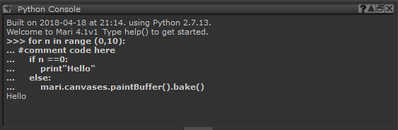 Mari's Python Console palette behaves in a very similar way to a standard Python console. Here’s how you use it: