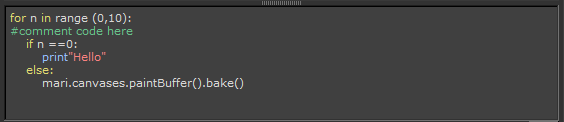 | 3. | Mari utilizes a syntax highlighting scheme in the input pane, so that code can be more easily identified at a glance. Text in red represents strings, dark blue represents comments, and various Python keywords are represented by yellow, magenta, and blue. |
