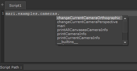 Displays available functions that follow the statement:Tip: You can temporarily turn off Mari's auto-complete function in the Python Console by pressing Esc when the auto-complete list appears.