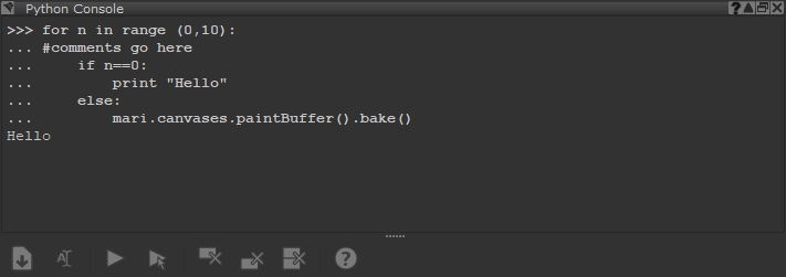Mari's Python Console palette behaves in a very similar way to a standard Python console. To open the Python Console in Mari you can: