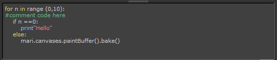 - Mari includes a syntax highlighting scheme in the input pane, so that code can be more easily identified at a glance. Text in red represents strings, green represents comments, and various Python keywords are represented by yellow, magenta, and blue.