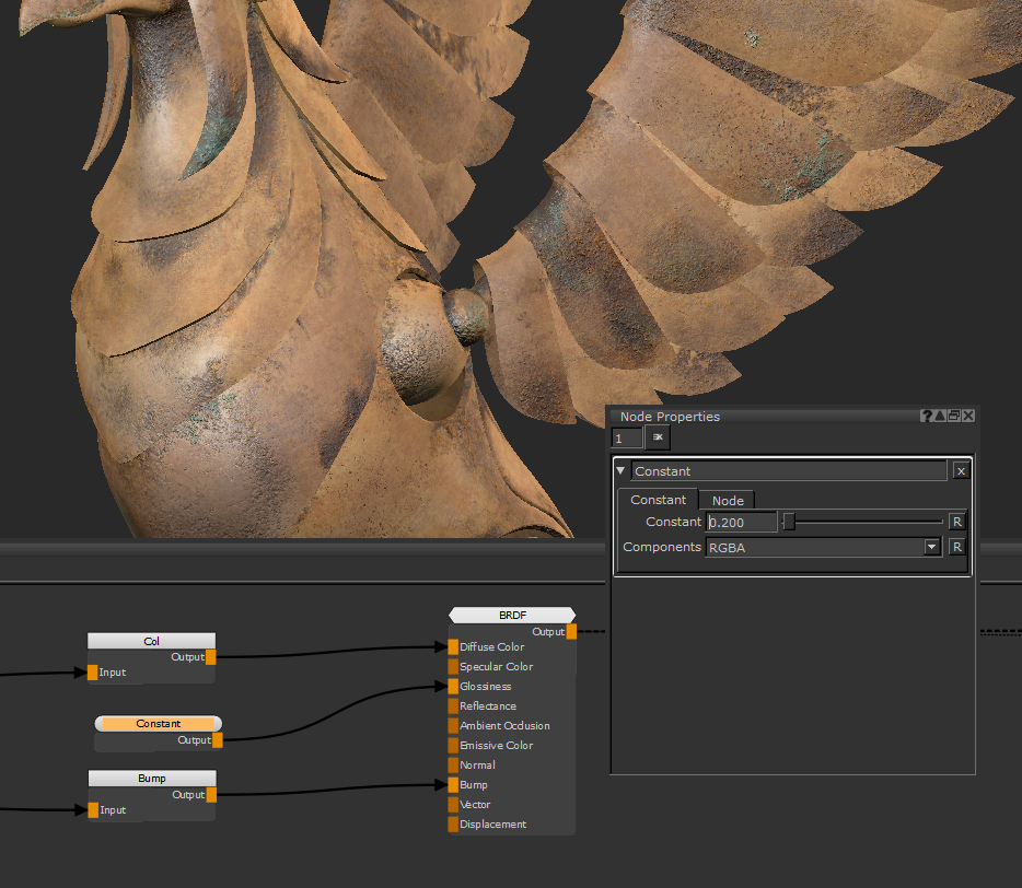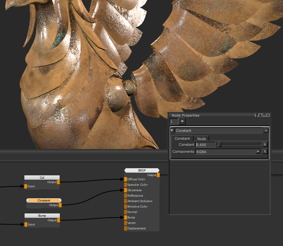 We can use a Constant node plugged into Glossiness. This is just a value between 0 and 1 that we can use to find a value to start painting our roughness map with.
