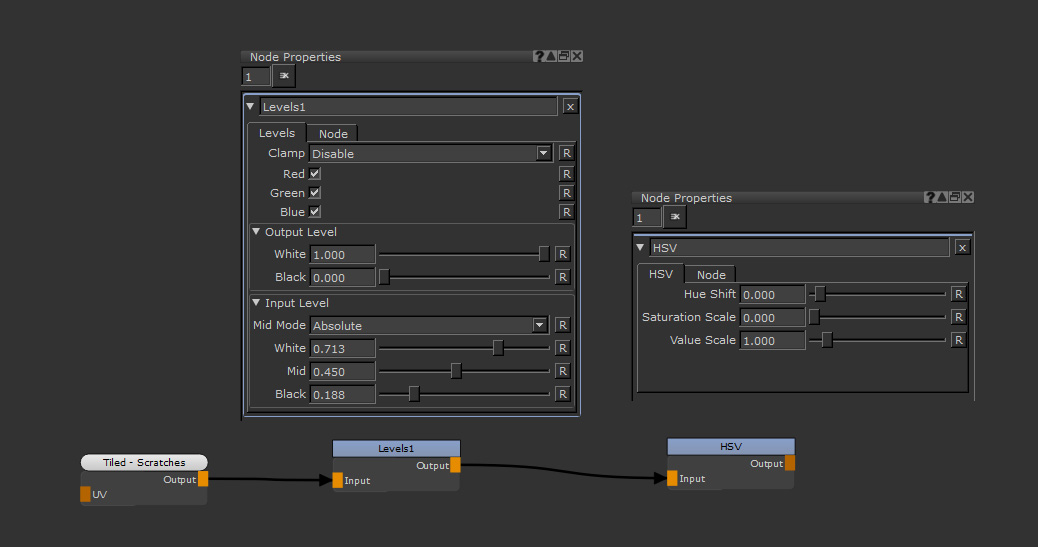Lets get this image from our image manager onto the mesh by adding it as a Tiled node. Next, use a Levels node to make the image more contrasted, and then an HSV node to remove the unwanted saturation of the image.
