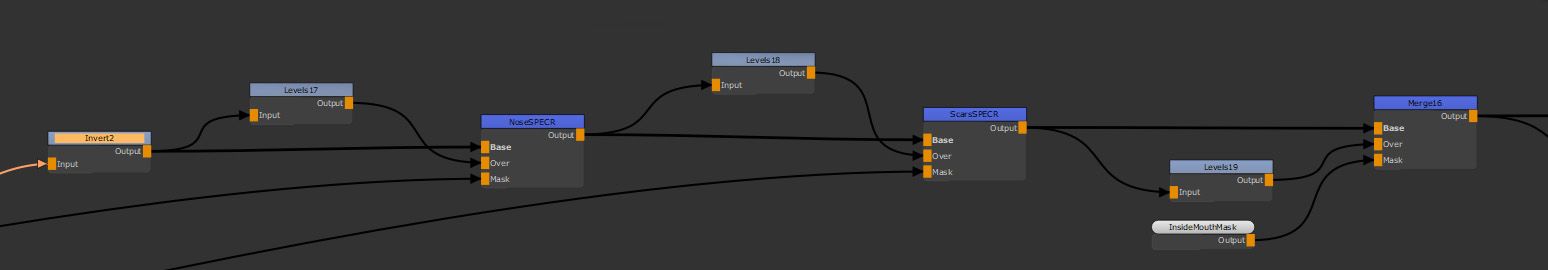 From there you can use Levels nodes to apply different grades to different parts of the mesh. Since inside the mouth, the nose and around the eyes should appear wetter, creating a mask for them and using a Levels node means you can grade them darker, making the spec tighter.