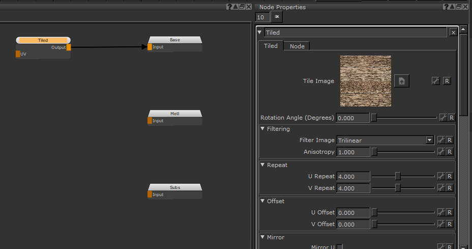 Next we need a tiled texture. You can create one by dragging an image from the Image Manager into the Node Graph. This creates a Tiled node containing your selected image. From there you can change your scale so it looks right for you and make any other edits to the Tiled node until you get something you are happy with. Then it’s time to plug that into the Base Color output.