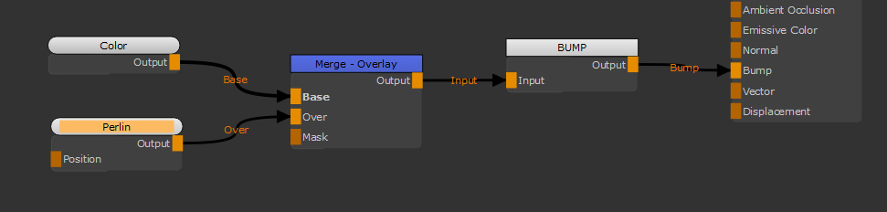 Here we have a flat color with a Perlin node being merged on top with the Overlay mode. This feeds into the Bump Channel node which leads into a Principled BRDF Shader.