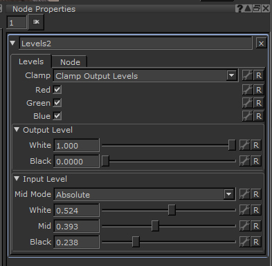 The settings used on the Levels nodes. The Clamp property has been used to flatten the top of the bump peaks.