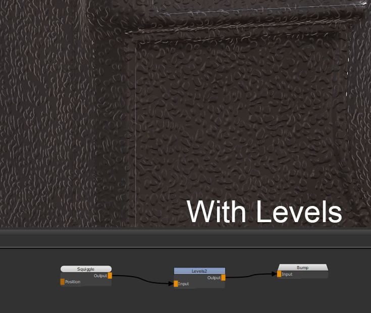 The Squiggle has a range of values giving smooth rounded peaks on the bump. The reference has flattened peaks instead of rounded ones, so using a Levels node helps to add contrast and raise the values closer to white. We can then take advantage of the Clamp feature of the Levels node to flatten off the top and help better match the reference.