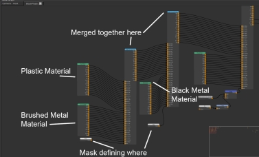While it may look overwhelming when zoomed out, it’s a very simple project. The project is just a connection of Material nodes merged together using the Multi-Channel Merge node, utilizing masks that define where different materials should go.