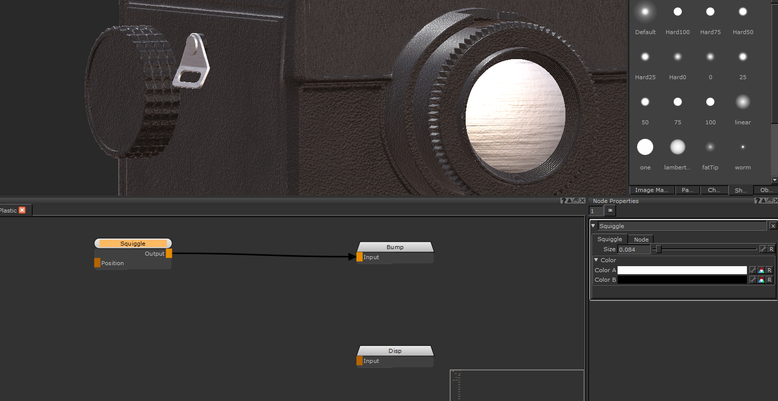 The Squiggle node has quickly helped make the bump for this material, something that wouldn’t have been as quick to achieve with another noise or method. The final material looks closer to our reference now than it did just using a Perlin node. Each procedural noise has their own benefits. The black metal material on the top of the camera has also had a bump added in the same way, but using the Sphere node.