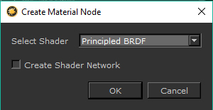 First you need to place down a Material node. The Create Material Node dialog asks for the shading model you would like to use. For this example Principled BRDF is selected but if you want to use another then the principles stay the same. If you toggle on Create Shader Network then a shader is also created that connects the Material node’s outputs to the shader.