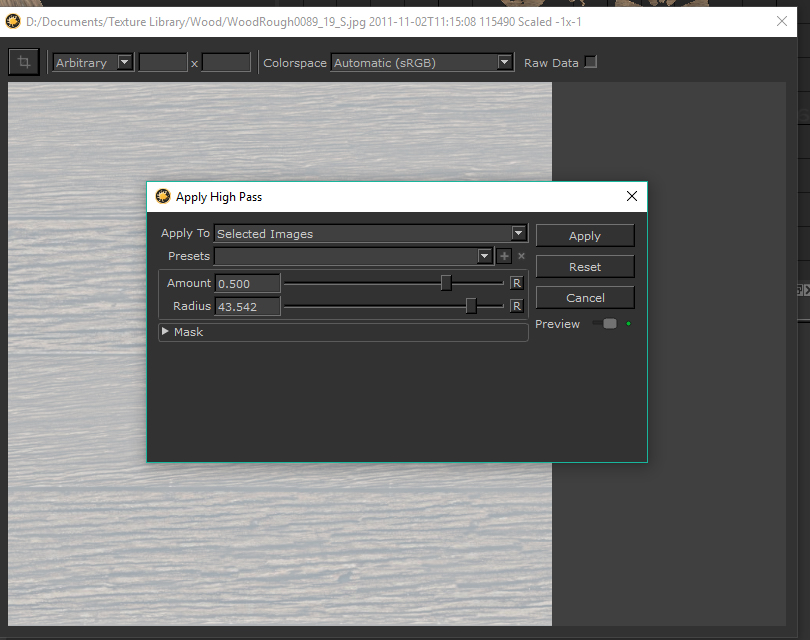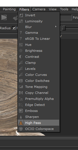 Finally to make a bump map you can use a High Pass filter on the wood texture in your Image Manager to get a quick height map from it. Make sure the Amount stays at 0.5 to get an image with mid-gray as the mid point like a bump map needs.