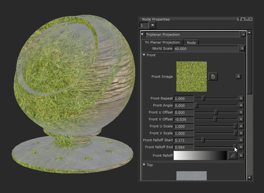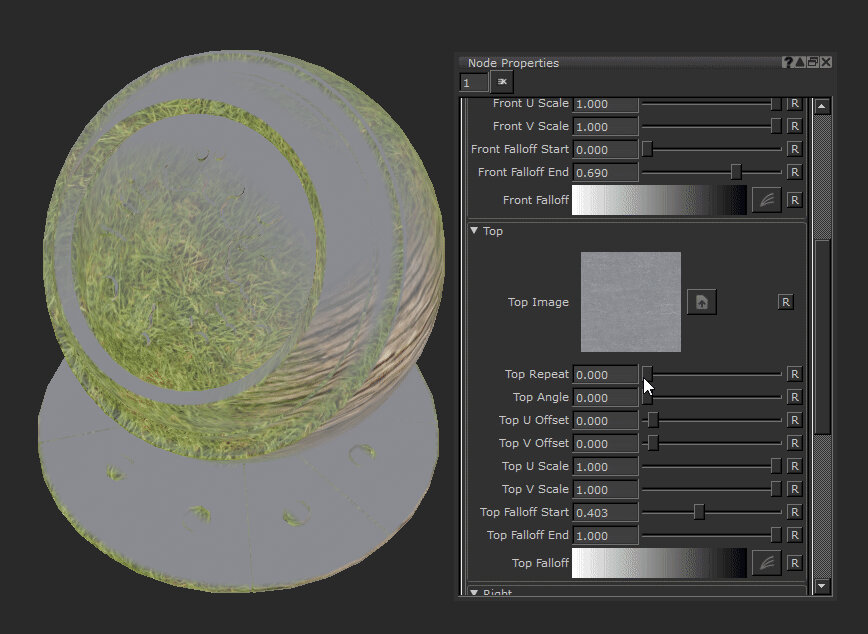 Changes the fall off of the top projection and the threshold at which angles the projection will cover. Raising this slider will make the projection cover more area on curved or glancing angles and may eventually overlap the other axes projections.
