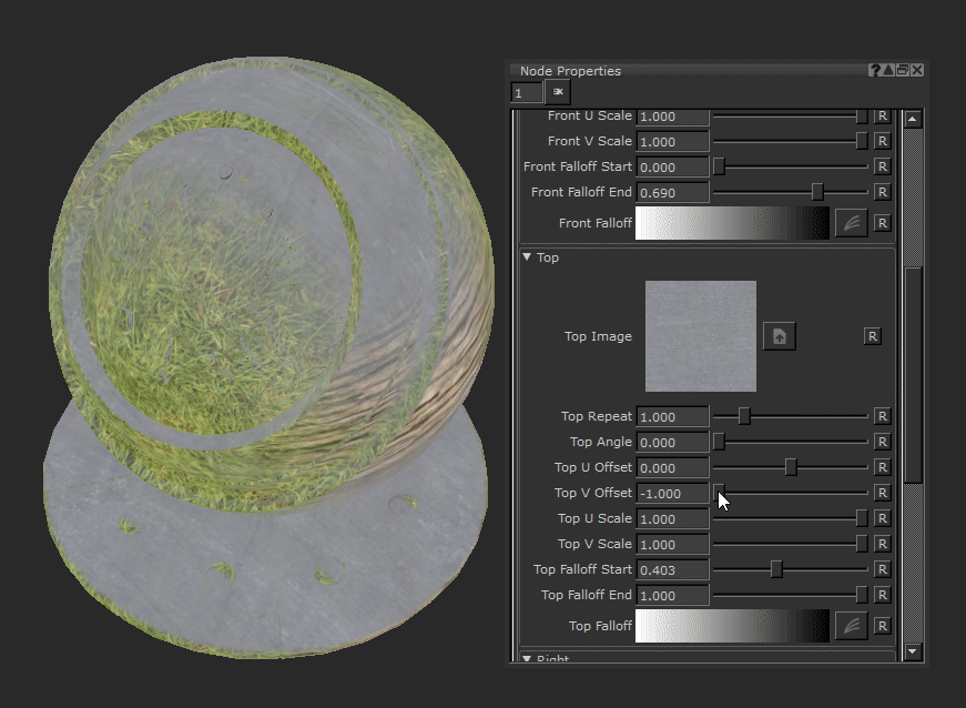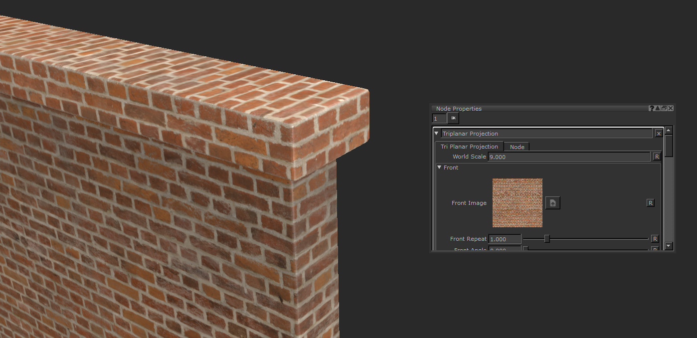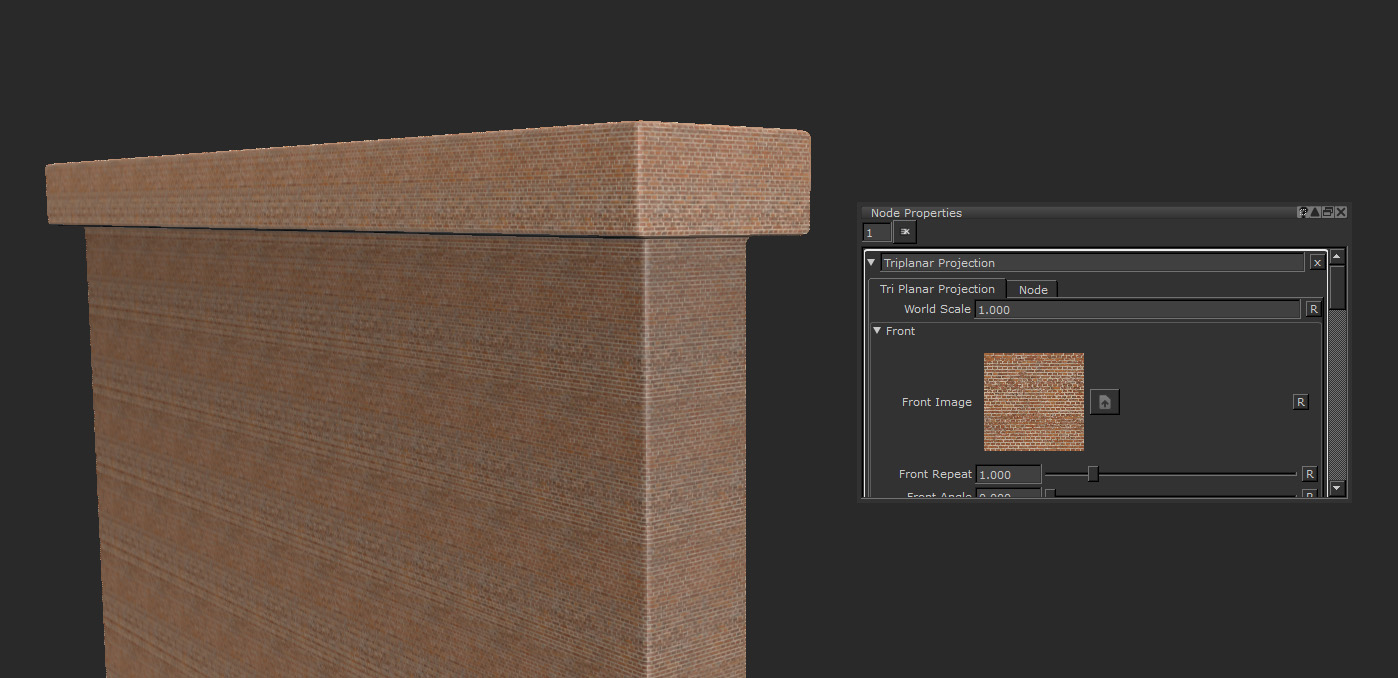 After connecting that same image from our Image Manager into the Front, Top and Right image of the node, already you can see the difference. While the scale may be off the tiles all look consistent and at the edges they line up correctly, even with our poor UVs.