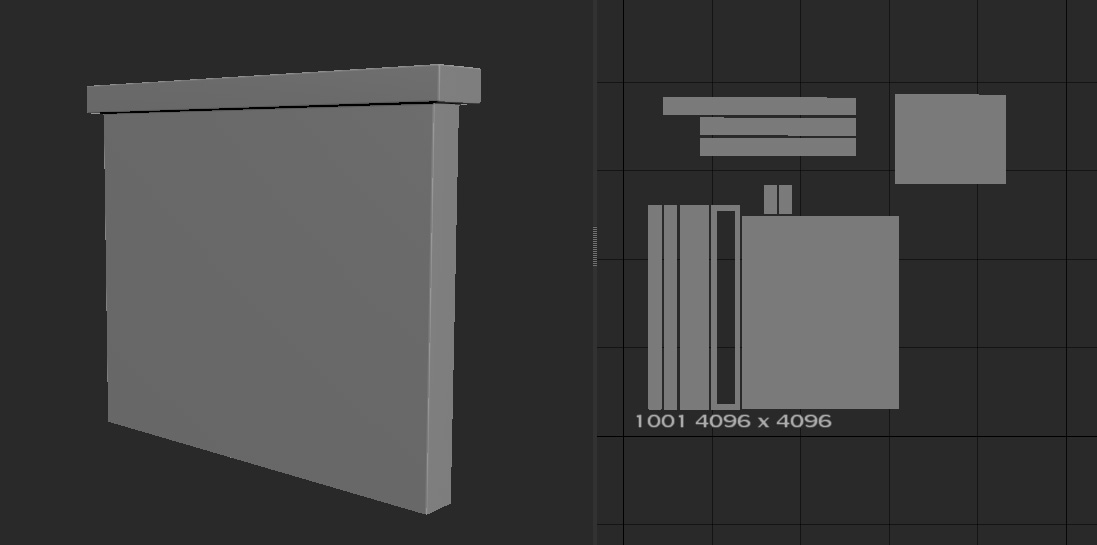 This basic rectangular wall object will be our geometry for this example. If we look at the UVs they are not ideal. They’ve had a quick automatic unwrap and they've been purposefully made worse by differing the scale of the shells and rotating some differently.