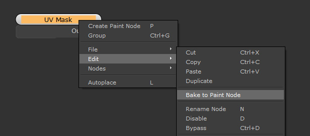 First we need to export the UV Mask node’s data. That requires us to bake it a Paint node first as you cannot export non baked nodes. To do that you just need to right-click the node and select Edit > Bake to Paint Node.