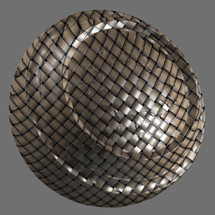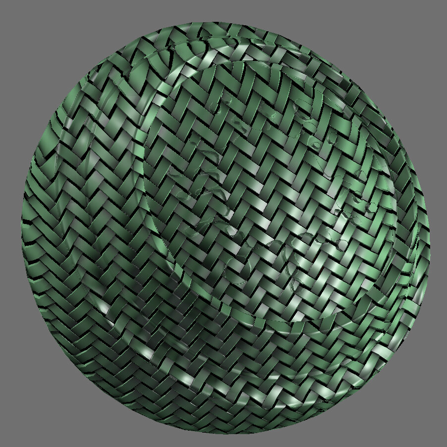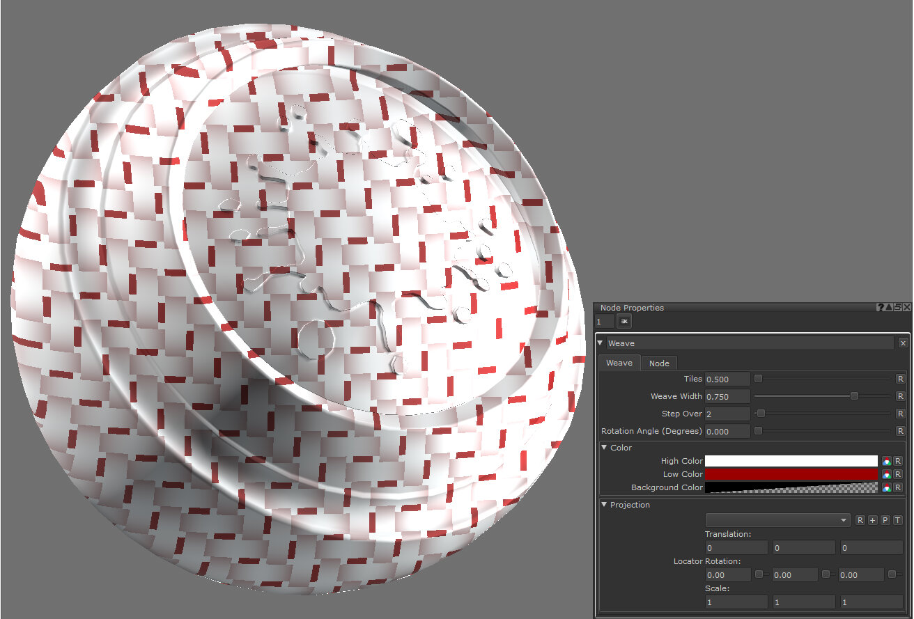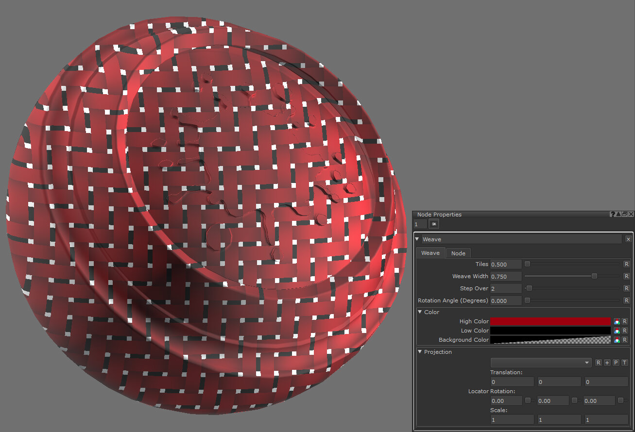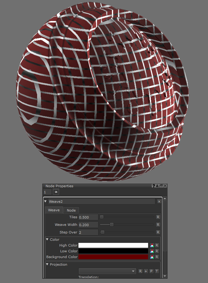 This node generates a pattern of interwoven strips. This can then be used as a height map, mask or as both to texture objects with a woven material.