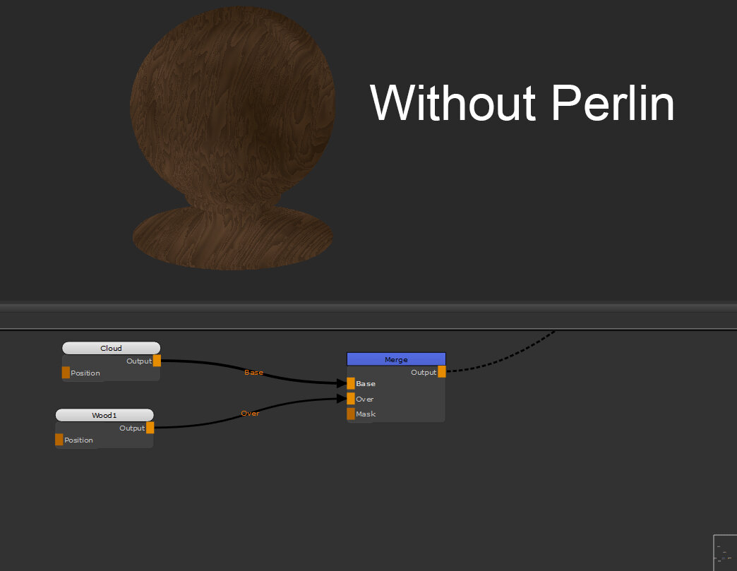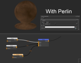 To add an extra level of realism, a Perlin node can be used as the mask. The result this has means the Wood node does not multiply evenly, in some places the effect is less obvious, breaking up the CG look which is always best avoided when texturing.
