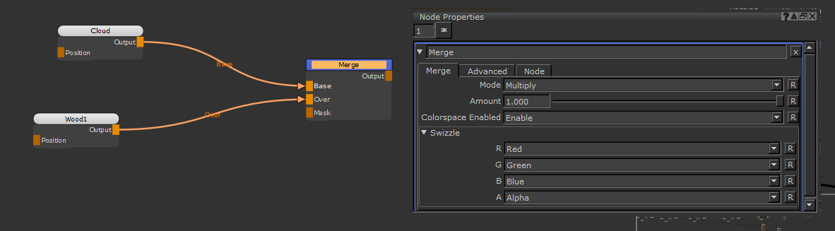 We need to merge these together next. A Multiple blend mode means we just get the darkness of the Wood node which emulates wood grain nicely. Make sure the Wood node is being multiplied on top of the colored Cloud by being plugged in the Over input.