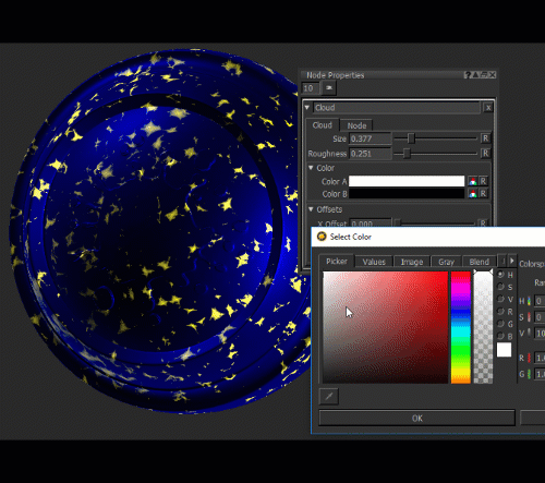 Notice how adjusting the Cloud node's foreground color (Color A) distorts the Cellular noise.