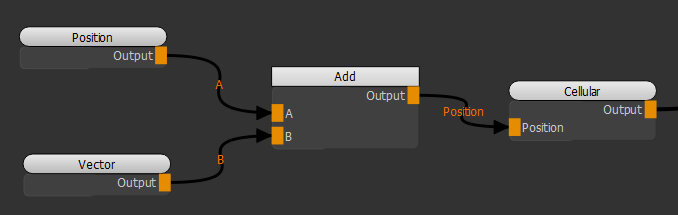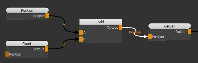 | 2. | Create an Add node and connect it to the Cellular node. Create a Cloud node and a Position node and connect them respectively to the A and B inputs of the Add node. |