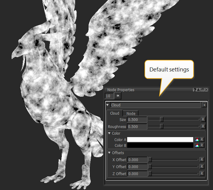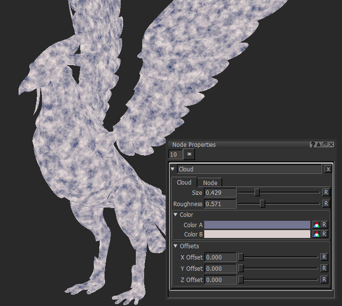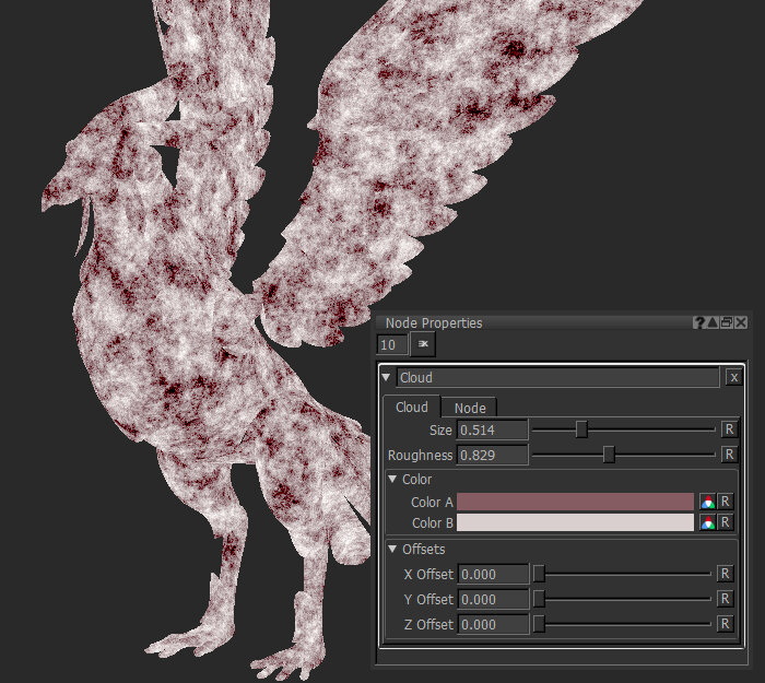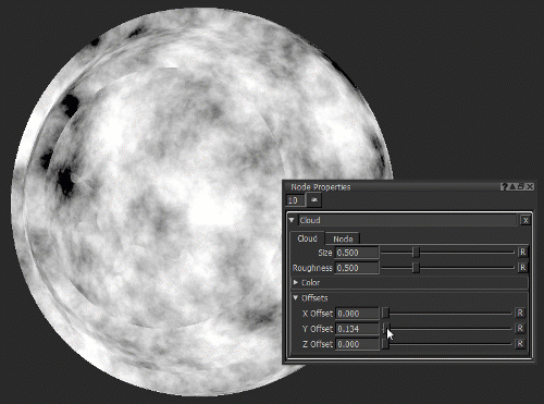 The Cloud node is represented in 3D space. Notice that this method doesn't contain UV seams.