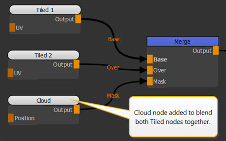 In this example, let’s use the Cloud node as a mask on top of two different textures (Tiled 1 and Tiled 2) to obtain a nice blended texture.