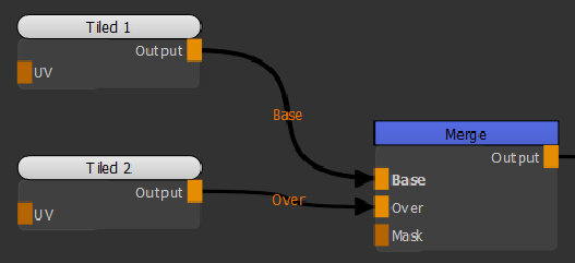 | 1. | Connect two Tiled nodes to the Merge node. The Tiled 1 node is connected to the Base input and the Tiled 2 node is connected to the Over input of the Merge node. |