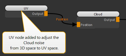 | 2. | Create a UV node and connect it to the Position input of the Cloud node. |