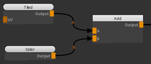 In the example below, let’s use an Add node to blend a Tiled and a Color node together.