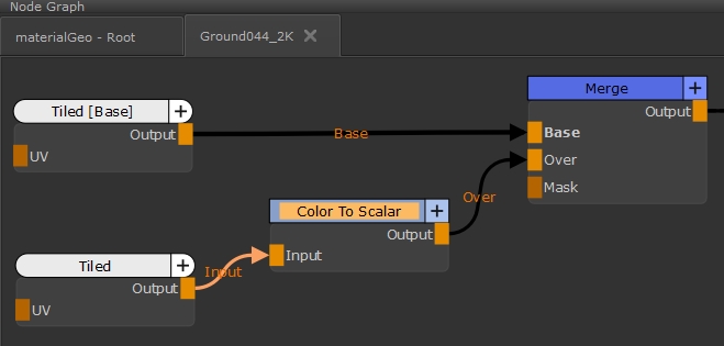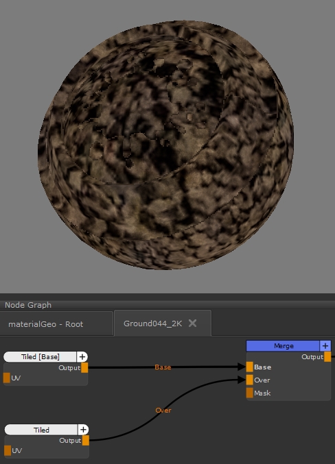 This example shows the internal node tree in a Material node. In this case, we're blending a tiled color image of some gravel, Tiled, with the base color, Tiled [Base], using an overlay blending mode in the Merge node.