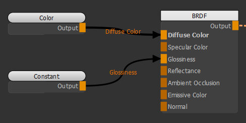 | 3. | Create a Constant node and connect it to the Glossiness input of the BRDF node. |