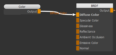 | 1. | Create a Color node and connect it to the Diffuse Color input of the BRDF node. |