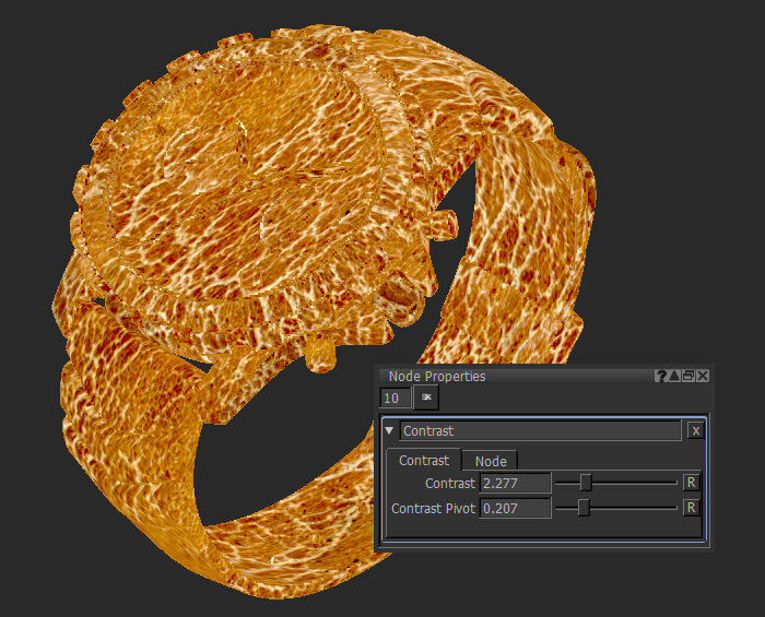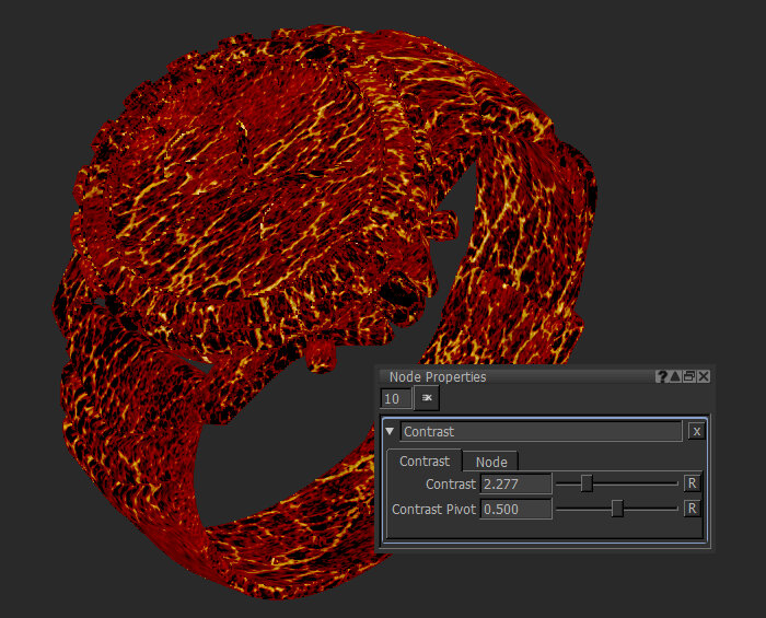 In the example below, let’s use a Contrast node to emphasize the dark brown pigments of the model.