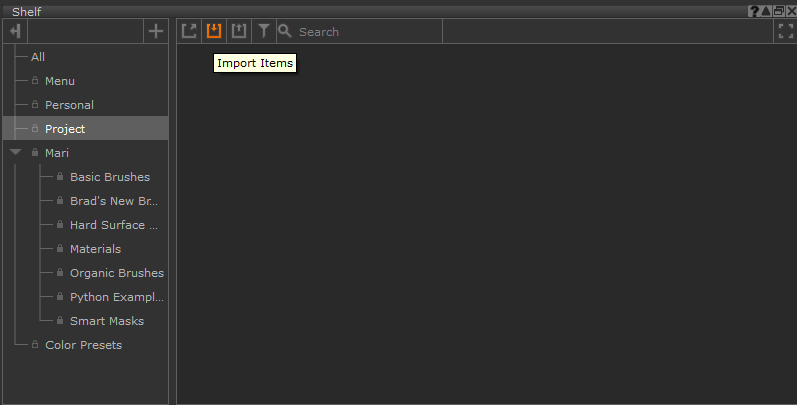 | 2. | In the left panel of the Shelf, select a folder where you would like to add your procedural. Note: The Smart Masks shelf is locked, so you will need to use the Personal, Project or a custom shelf. |