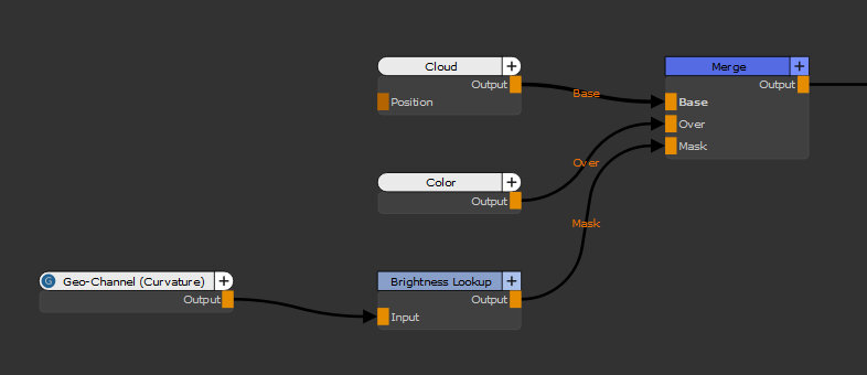 The next stage of the workflow deals with adding geo-channels to the node network. Geo-channel nodes point the texture at geo-channels on your object. In this example workflow, the geo-channel is used to drive curvature data from the model into the texture, so the grime appears on any sharp edges of your model.