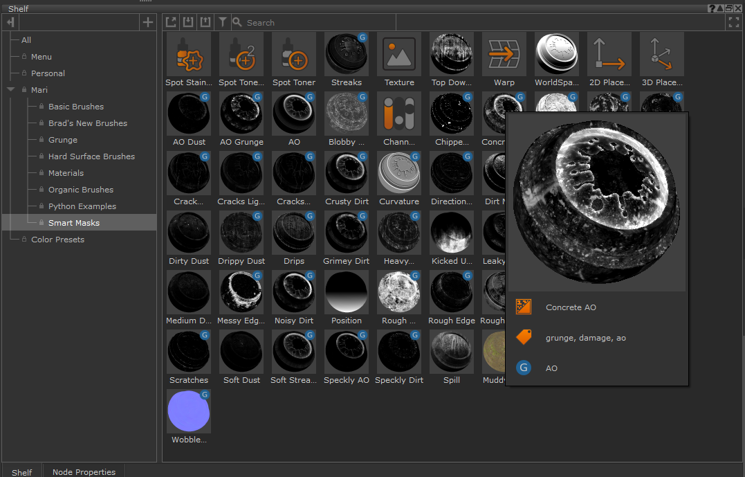 There are a variety of example Smart Masks for you to use in the Smart Masks shelf. This includes basic masks which utilize maps such as Ambient Occlusion, and a variety of grunge maps in order to easily achieve looks such as dirt, dust and damage. These can be helpful as a starting point, which you can then adjust to work for you. In the Smart Mask shelf you’ll also find a set of utilities, such as warp and spot stainer, which can help with refining your textures. For a full overview of the content that is available, see Ready-to-use Shelf Content.