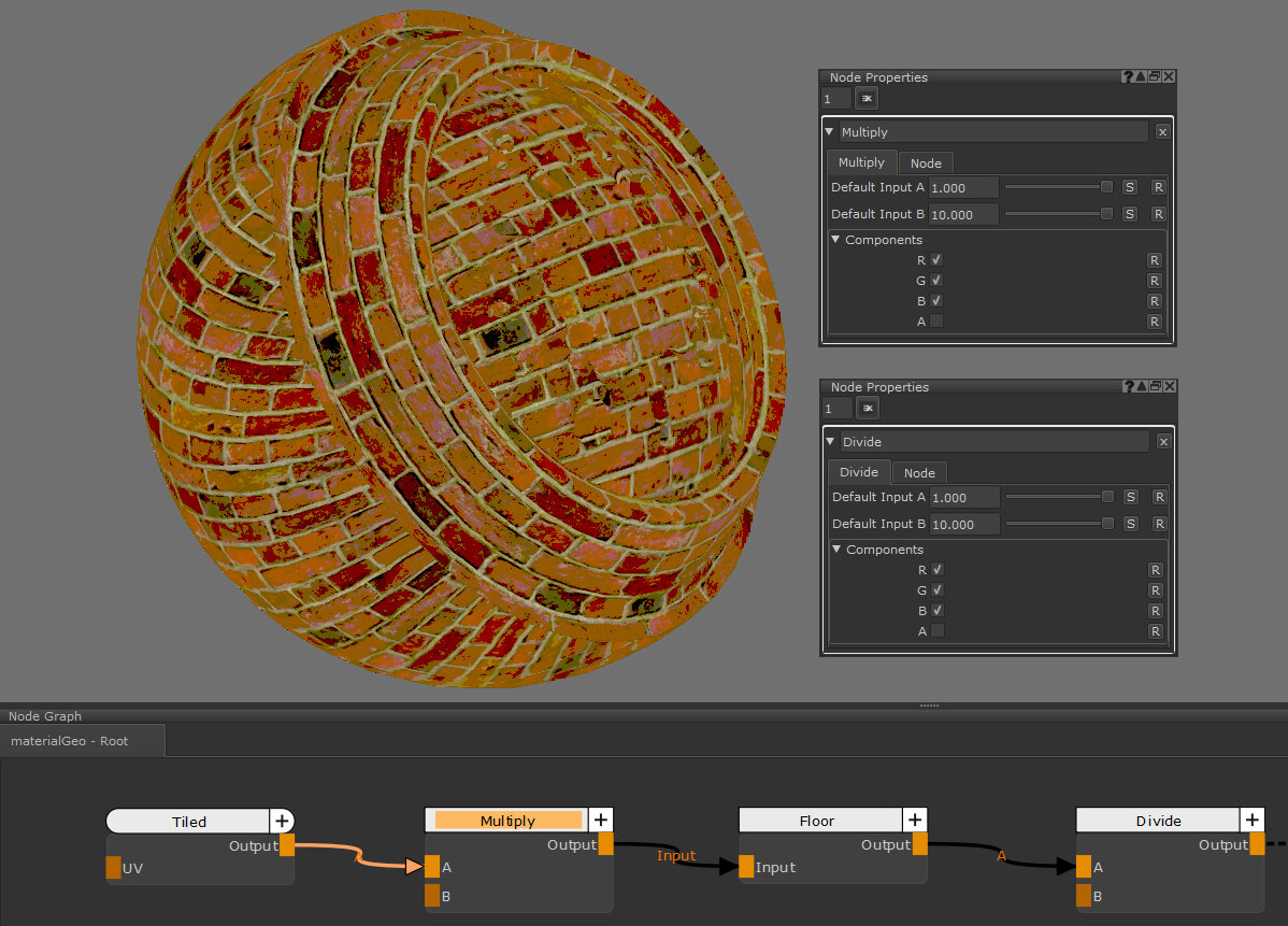 Note: The Floor node produces a similar posterize effect to the Ceil node but because it rounds the input values down, the resulting colors will appear darker.