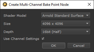 When you create a Multi-Channel Bake Point node, the Create Multi-Channel Bake Point Node dialog is displayed and you can choose the settings to apply to the node and the elements that are baked from it. After choosing the appropriate options, click Okay and the Multi-Channel Bake Point node is created.