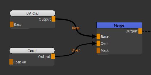 | 1. | Create a UV Grid node and a Cloud node and connect them respectively in the Base and Over inputs of the Merge node. |