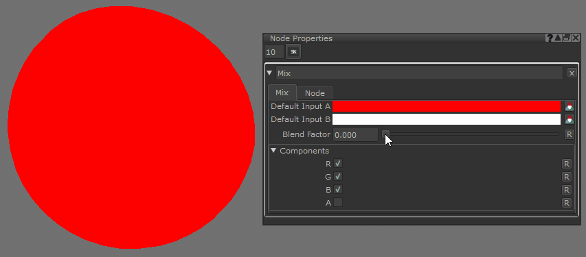 The Mix node linearly interpolates between two color inputs based on an input blend value. If the Blend Factor is 0, color A is output. If the Blend Factor is 1, color B is output. A Blend Factor value between 0 and 1 outputs a relative mix between A and B.