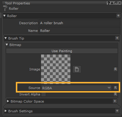 | 6. | With the Roller Brush selected, go to Tool Properties > Brush tip > Source and change the value from Alpha to RGBA. |