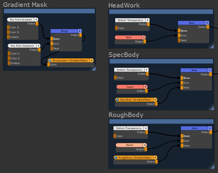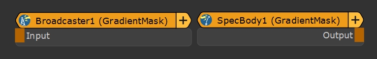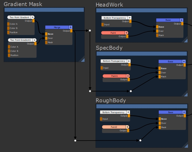 In this simple example, we'll reuse a gradient mask in specular and roughness operations without cluttering up the node graph with Dot nodes and connectors. The image shows the Gradient Mask connected up to the Mask inputs of two Merge nodes using standard Mari connections.