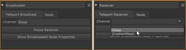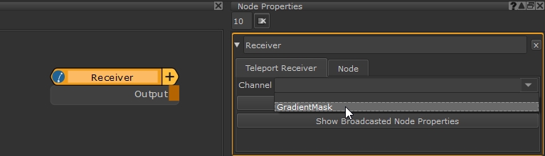To create a connection between a Teleport Broadcaster and a Teleport Receiver node, just use the same Channel name in both nodes. You can enter a name into the Channel control in the node Properties manually or select an existing Channel from the dropdown in the receiver's Properties.
