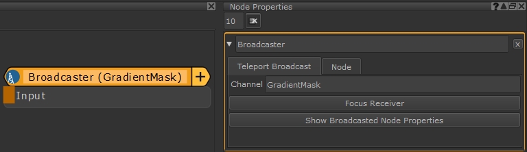 Click to quickly display the Properties of the node connected to the Teleport Broadcaster node's input. |